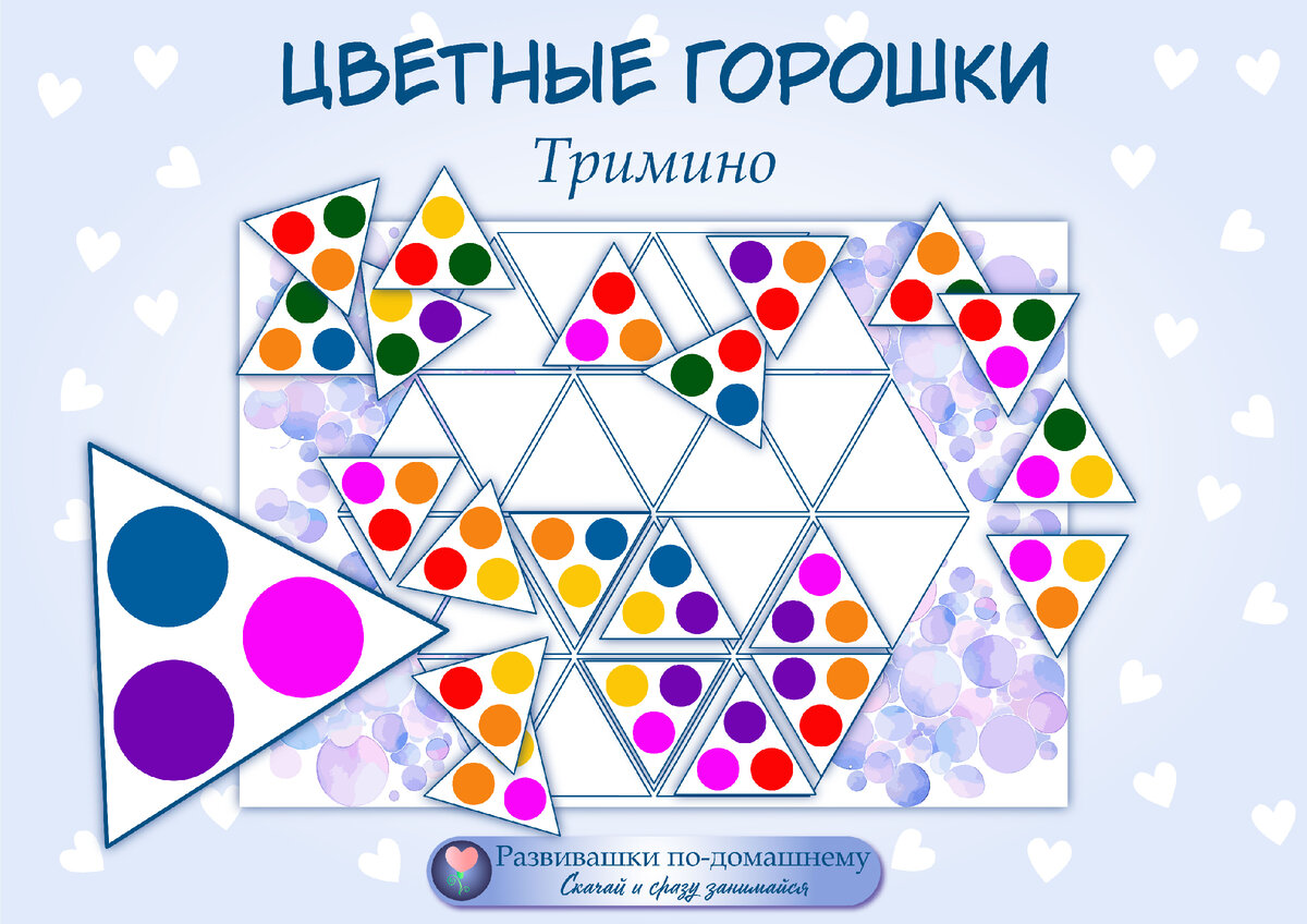 Все фишки игры - это равносторонний треугольник, на каждом ребре которого 2 горошинки определённого цвета. Задача игры - соединять свои фишки с другими так, чтобы горошинки совпадали по цвету. Можно играть на предложенном игровом поле или без него. ❤️💚💙Скачать можно в моем каталоге авторских игр (более 360 игр) в рубрике Головоломки 👇тык 💜🧡💛или на WB 👇