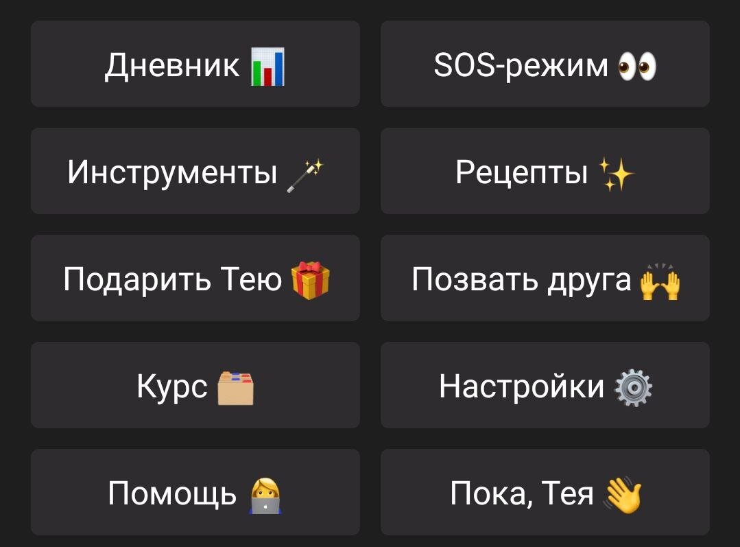 ТЕЯ не про это. Бот реально нацелен на то, чтобы адекватно относится к питанию. Это не врач, не волшебная таблетка, не психотерапевт. Это робот. Не забывайте об этом.
