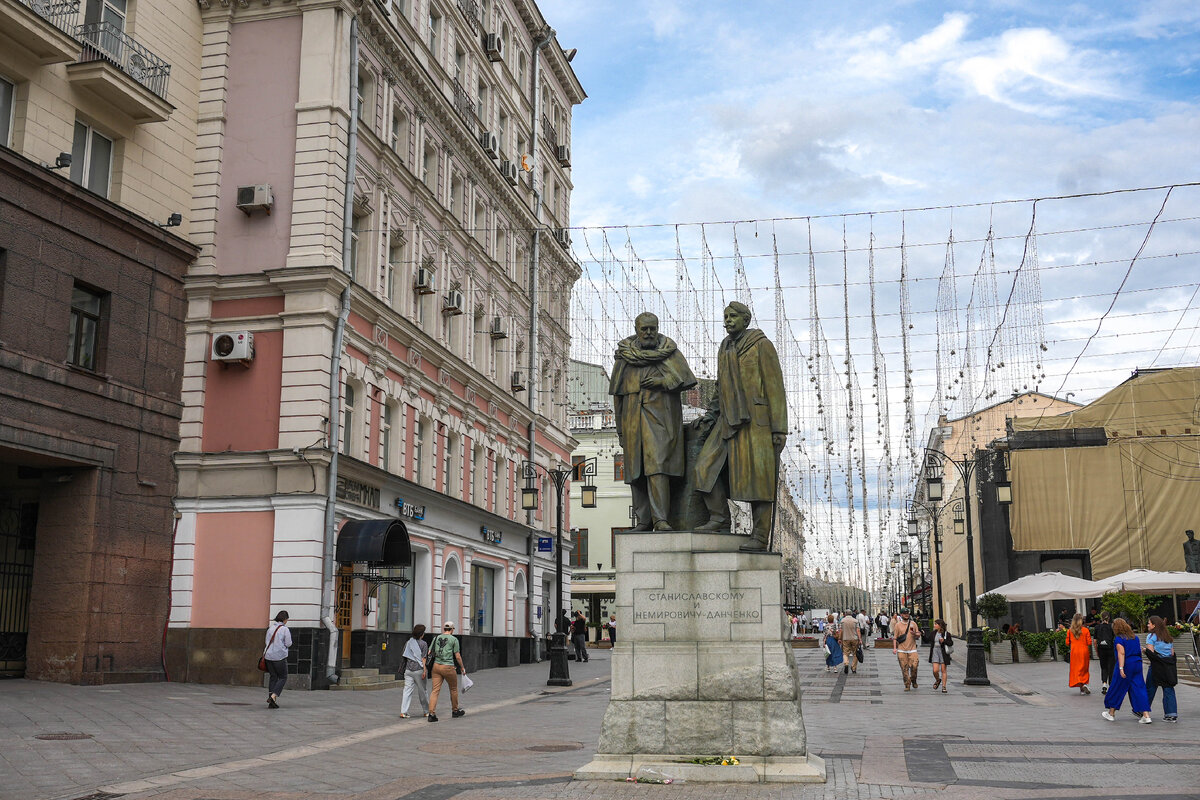 В своих заметках я часто ругалась на обустройство Никольской улицы в Москве, но в центре есть один переулок, который пострадал от украшательств и коммерции ещё сильнее. Между Тверской и Большой Дмитровкой расположился красавец Камергерский переулок. В своё время к убранству этих 250 метров истории приложили руку такие архитекторы как Шехтель, Чичагов и Фрейденберг. Нумерация домов начинается со стороны Тверской и мы с вами так и пойдём. Как только заходим в переулок, так взгляд сразу врезается в памятник основателям МХТ им. А. П. Чехова Станиславскому и Немировичу-Данченко. Установлен в 2014 году. И вроде бы логично место выбрано. МХТ-то рядом. Но почему нельзя было памятник поставить поближе к театру? Например, вместо этого кафе и не закрывать перспективу переулка? Если от памятника посмотреть направо, то мы увидим следующую картину. Туалеты, общарпаная мемориальная доска поэта Асеева и бедный Чехов, которого совсем не видно из-за очередных столиков. Обложили вас, Антон Павлович, с