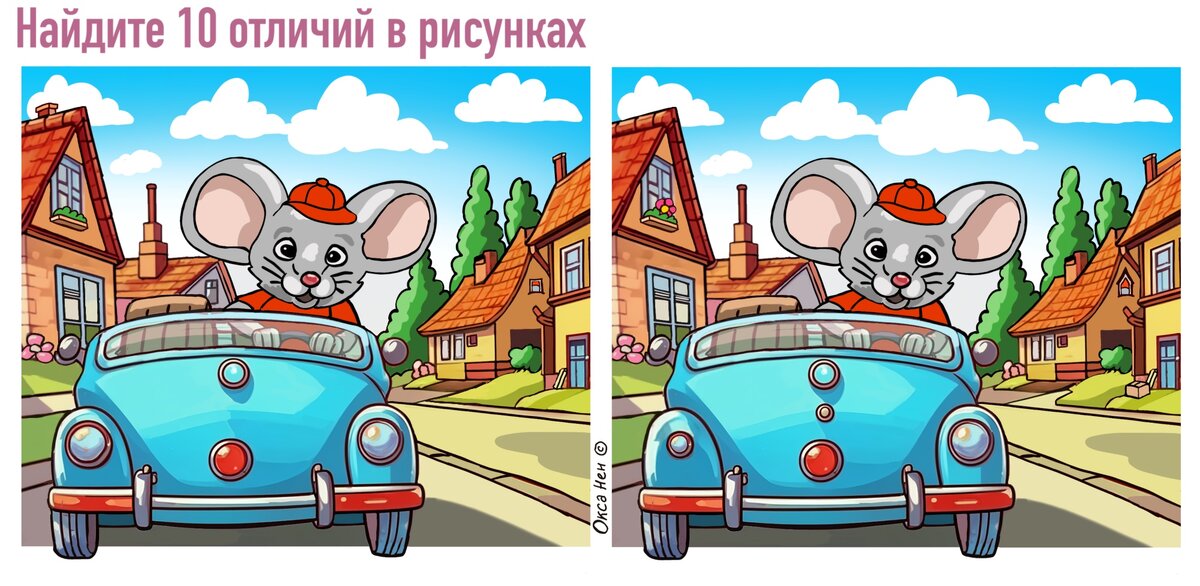 Найдите 10 отличий на картинках про мышонка на автомобиле. Задание на развитие внимания и памяти.