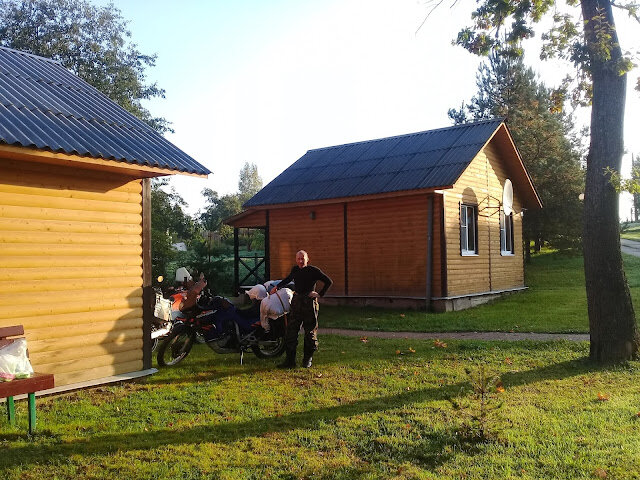 На входе дядя требует надеть маску, которую я ещё ни разу за весь вирусняк не надевал. Закрываю фэйс и с трудом дыша, проходим в магазин. С непривычки воздуха не хватает, хочется выбросить этот намордник и закричать "как вы в этом ходите?". Купили коврик и уже у мотоциклов обратили внимание, что коврик узкий и предназначен для выполнения на нём упражнений. Возвращаемся обратно, сдача, новый коврик, а это всё время. Несколько часов пути, пробег 0. Тут Саша говорит что хочет заехать в Макдональдс покушать, но мы с Алесей решаем ехать. У нас скорость меньше, нам важнее скорее выехать. Едем по загруженной кольцевой. Сначала я присматривался к общему стилю движения и скоро съехал в крайний левый ряд. который был на ремонте. Пробки пройдены, но указателя на Мурманск мы не встретили, хотя проехали прилично. Странное название Cola, ничего не дающая несведущему человеку, сбивала с толку. Вроде разобрались что это название трассы идущей в Мурманск, но почему нет поворота. Оказалось что поворот я прошляпил и мы будем скоро в Выборге :) . Разворачиваюсь, еду обратно по нескончаемой полукольцевой. Навигация по знакам напоминает квест. Попробуй разгадать! Вспомнились дороги и навигация в Австрии и думаешь, сядь дядя или тётя, разработчик дорожного движения, на машину и посмотри как и где лучше повесить знаки и указатели. Находим злосчастный поворот, облегчённый вздох, следующий контрольный поворот Лодейное Поле. Дорога нормальная, но неспешная. Ещё перед выездом читал, что будет отрезок очень плохой дороги от Ошты до Вытегры. Хотелось проехать его до темноты, но конец сентября и в сумерках мы въезжаем в лесную глушь с раскисшей гравийной дорогой. Небольшой слой жидкой грязи залил всю поверхность, хорошо под ней твердое, но неровное основание. Проехали небольшой участок, остановились проверить навигацию, неужели это трасса? Может мы пропустили поворот? Сверяемся, нет, едем правильно. Стоя в тишине и осматриваясь в после закатном лесу. Подумали - что будет если придётся вот тут остаться на ночёвку с палаткой? Медведи? Волки? Жутковато. По иронии судьбы "Мапс Ми" показал что мы находимся в урочище Левина. Смешно? Или это Саша нам знак подаёт? Стоим, отдыхаем и тут слышим, в тиши нарастает басистый гул, словно неведомый зверь-Горыныч учуял человечину-мотоциклетину. Страшный звук отражался со всех сторон, по земле пошла вибрация. Стоя на ногах, прямо чувствовалась земная дрожь. Спустя пол минуты мы поняли что это едет большегруз и пора тикать. Руки в руль, мчим дальше. И о сказка! Выезжаем на залитый лучами фонарей участок с Теремом под названием "МФК Рубеж", да заправкой "Севергазнефть". Радости и изумлению нет предела. Пока заправлялся, местный на Ниве сказал что дальше дорога ещё хуже, ямы в пол метра, камни, грязь, в общем дичь дикая. Советует остановиться в местной гостинице. Такая мысль мне пришла ещё раньше, но я пока не делился ей с Алесей. Впереди 200 км, на часах примерно 21.00, неизвестная дорога, а ночью ориентироваться тяжелее и скорость падает. Решаем ночевать тут. На входе встречаю хозяина заведения Михаила, познакомились, он любезно рассказал как у них уютно и пригласил проверить это самим. Гостиница действительно оказалась шикарной. Номер стоил 2700 руб или 35$ на двоих. Всё новое, в номере тапочки, белый махровый халат, душ, туалет, интернет, мини-холодильник с м