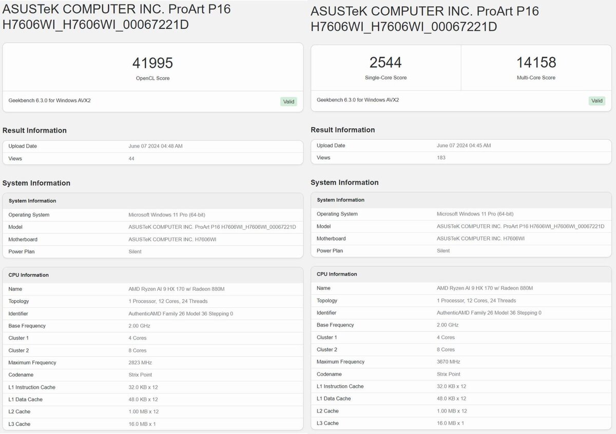 В базе данных Geekbench появились результаты тестирования флагманского процессора AMD Strix Point, включая его интегрированную графику. Сразу же стоит отметить, рассматриваемый процессор имеет обозначение Ryzen AI 9 HX 170, а его графика Radeon 880M, однако, как сообщалось накануне, на рынке этот процессор появится под названием Ryzen AI 9 HX 370, а его графика переименована в Radeon 890M. Как предполагается, решение AMD изменить схему именования было запоздалым, уже после того, как компании подготовили образцы ноутбуков, поэтому обозначения отличаются. AMD Ryzen AI 9 HX 170 (370) — это 12-ядерный процессор с ядрами Zen 5 и Zen 5c, максимальной частотой 5,1 ГГц и графикой, которая содержит 16 вычислительных блоков RDNA 3.5 и может повышать частоту до 2,9 ГГц. В базе Geekbench можно найти три оценки процессора в ноутбуке ASUS ProArt A16, какой TDP был установлен для этих тестов, неизвестно, он может находиться в диапазоне от 15 до 54 Вт. На странице подробных результатов отображается ма
