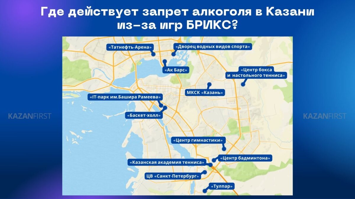 Продажу алкоголя запретят возле «Татнефть Арены», «ИТ-парк им. Башира Рамеева» и «Баскет-холла». С подробным списком адресов и общественных мест рядом с которыми будут действовать ограничения можно ознакомиться на карте.