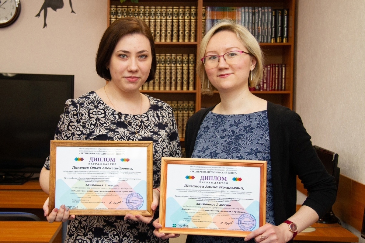 В феврале 2020 года были подведены итоги Всероссийского конкурса профессионального мастерства «Библиотечное пространство: современность и традиции» на приз научно-методического журнала «Наука и образование: новое время». В 24 номинациях конкурса приняли участие работники библиотек из 22 регионов Российской Федерации. Сотрудники библиотечно-информационного комплекса Алина Рамильевна Шигапова и Ольга Александровна Попенко представили на суд жюри проект БИК «Дорога в Россию» и стали победителями этого престижного профессионального конкурса.