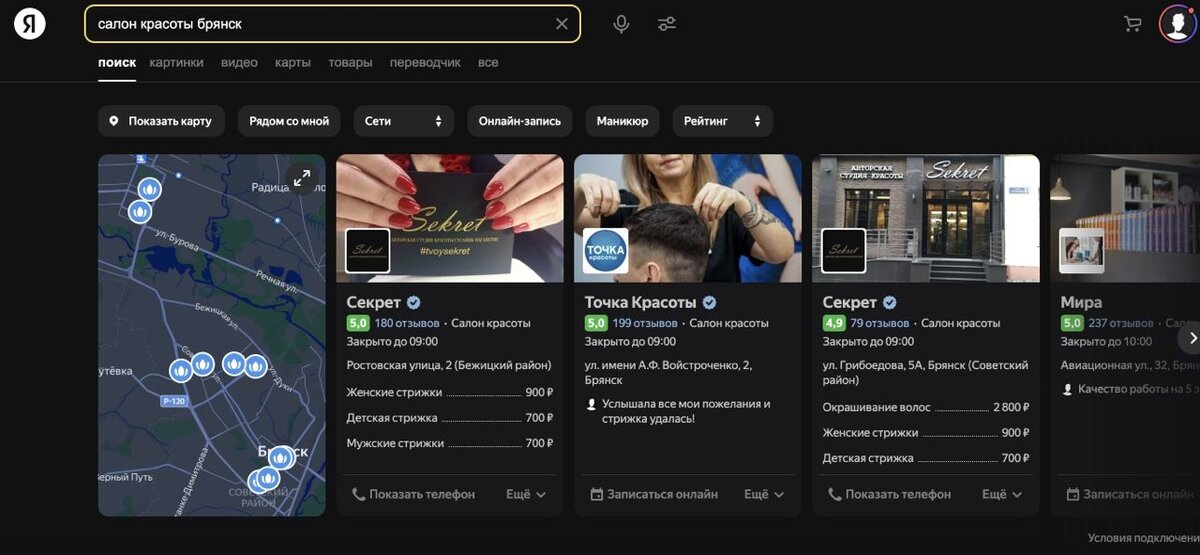 Цепанул заголовок? Думаете кликбейт, нет это чистая правда. На днях, с моим хорошим знакомым обсуждали точки на картах яндекса и геомаркетинг в целом. Геомаркетинг простыми словами, это реклама напарвленная на людей живущий в определенном радиусе от продвигаемой компании. Например пятерочка, туда ходят люди живущие в 300 метрах от этого магазина, люди живущие дальше пойдут в другую пятерочку рядом с их домом, так как асортимент одинаковый и эти магазины расчитаны, как «продуктовый у дома». А что если это услуга? Например, психоогическая помощь людям или даже грумер с выездом на дом. Обычно когда мы вводим подобные запросы, у нас первой строкой высвечиваются компании, которые занимаются своим продвижением на Яндекс и Гугл картах. Они лучше оптимиированы, даже количество отзывов не всегда влияет на высокую позицию. Пример, по запросу Салон Красоты Брянск выводяться 2 одинаковых компании, которые находяться в абсолютно разных районах. У данной компании не самое высокое количество отзывов,