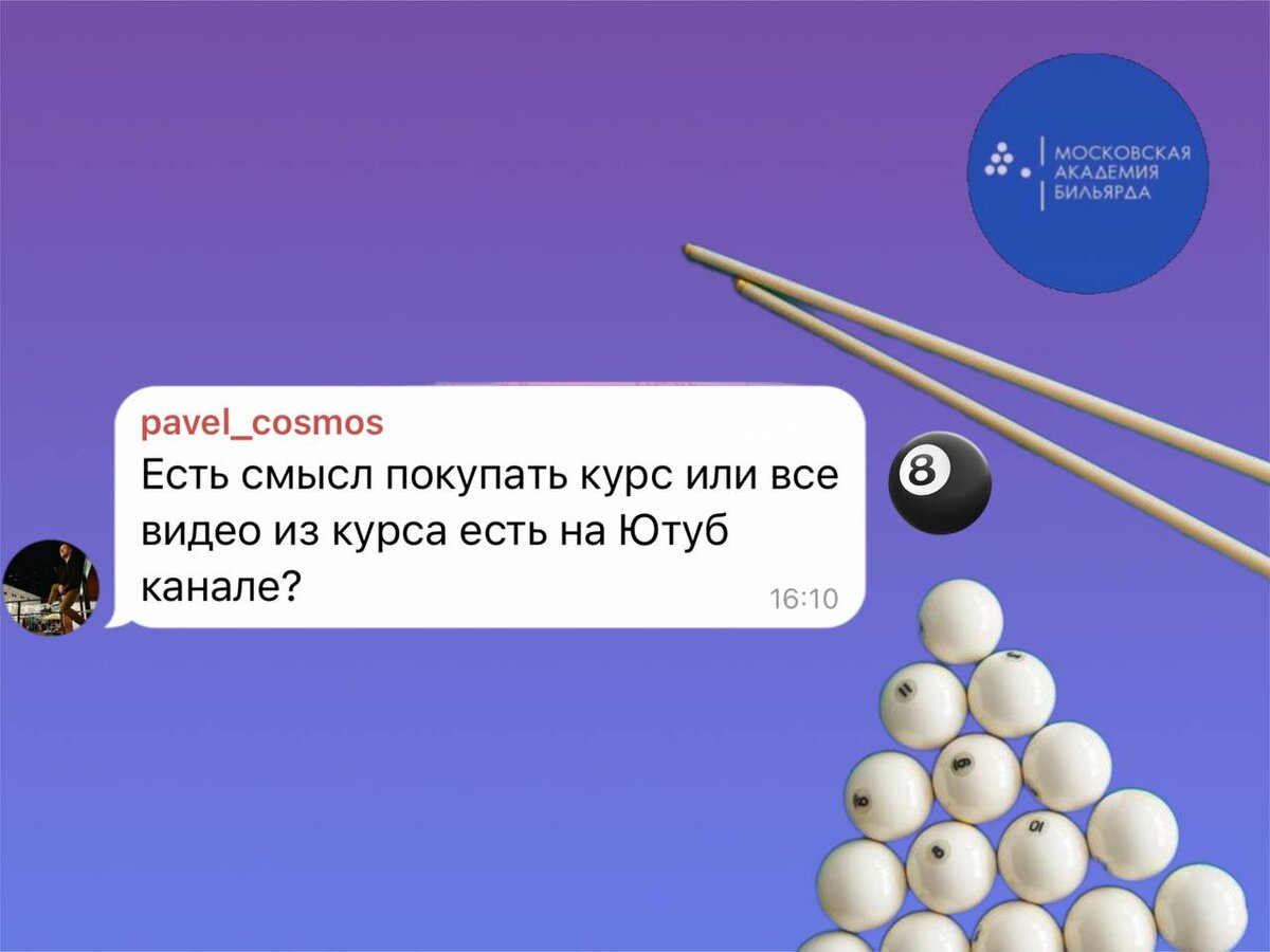 🤔Есть ли смысл покупать курсы или все видео из курса доступны на YouTube? Вопрос, который нам очень часто задают. Представьте, вы ищите в интернете «как научиться играть в бильярд». Информации много и сложно понять, что именно вам нужно. На курсах мы рассматриваем темы последовательно и все уроки структурированы, чтобы фокусировать вас действительно на важных вещах и на том, что необходимо именно сейчас. И что ещё важно! ☝🏽 На курсе у вас есть поддержка тренера (выше как раз мы писали подробнее о тарифах). Здесь ценность не только в полученных знаниях, но и в отработке ваших навыков с профессионалами, которые дополнительно вам помогают! Разница большая и она очевидная! Распродажа завершится сегодня (7 июня в 23:59 по мск). [ссылка для участия в распродаже] Успевайте выбрать продукты и тренируйтесь вместе с нами!