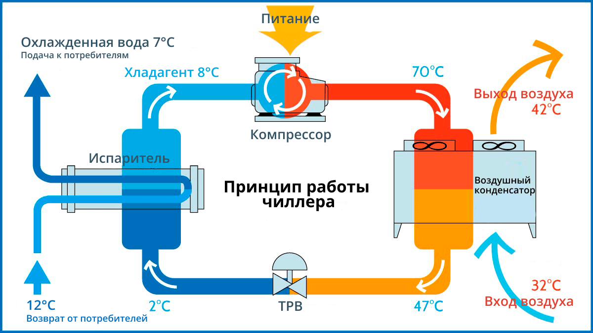 Принцип работы систем охлаждения воды при помощи чиллеров с воздушным охлаждением конденсатора почти такой же, как и у чиллеров с водяным охлаждением. Однако, для отвода теплоты от охлаждаемой воды вместо использования градирен или драйкулеров, чиллеры с воздушным охлаждением конденсатора оснащаются теплообменником типа «фреон-воздух» и вентиляторами. Поэтому некоторые внутренние компоненты чиллеров с воздушным охлаждением несколько отличаются от чиллеров с водяным охлаждением.