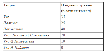 В языке запросов поискового сервера для обозначения логической операции «ИЛИ» используется символ «|», а для обозначения логической операции «И» –– символ «&». В таблице приведены запросы и количество найденных по ним страниц некоторого сегмента сети Интернет. Какое количество страниц (в сотнях тысяч) будет найдено по запросу Подкова & Наковальня? Считается, что все запросы выполнялись практически одновременно, так что набор страниц, содержащих все искомые слова, не изменялся за время выполнения запросов. РЕШЕНИЕ Изобразим на диаграмме имеющиеся данные: Отметим область, которую нужно найти: Ухо + Наковальня + Подкова - Ухо И Наковальня - Наковальня И Подкова = Ухо ИЛИ Наковальня ИЛИ Подкова Наковальня И Подкова = Ухо + Наковальня + Подкова - Ухо И Наковальня - Ухо ИЛИ Наковальня ИЛИ Подкова = 35 + 40 + 25 - 10 - 70 = 20 ОТВЕТ 20