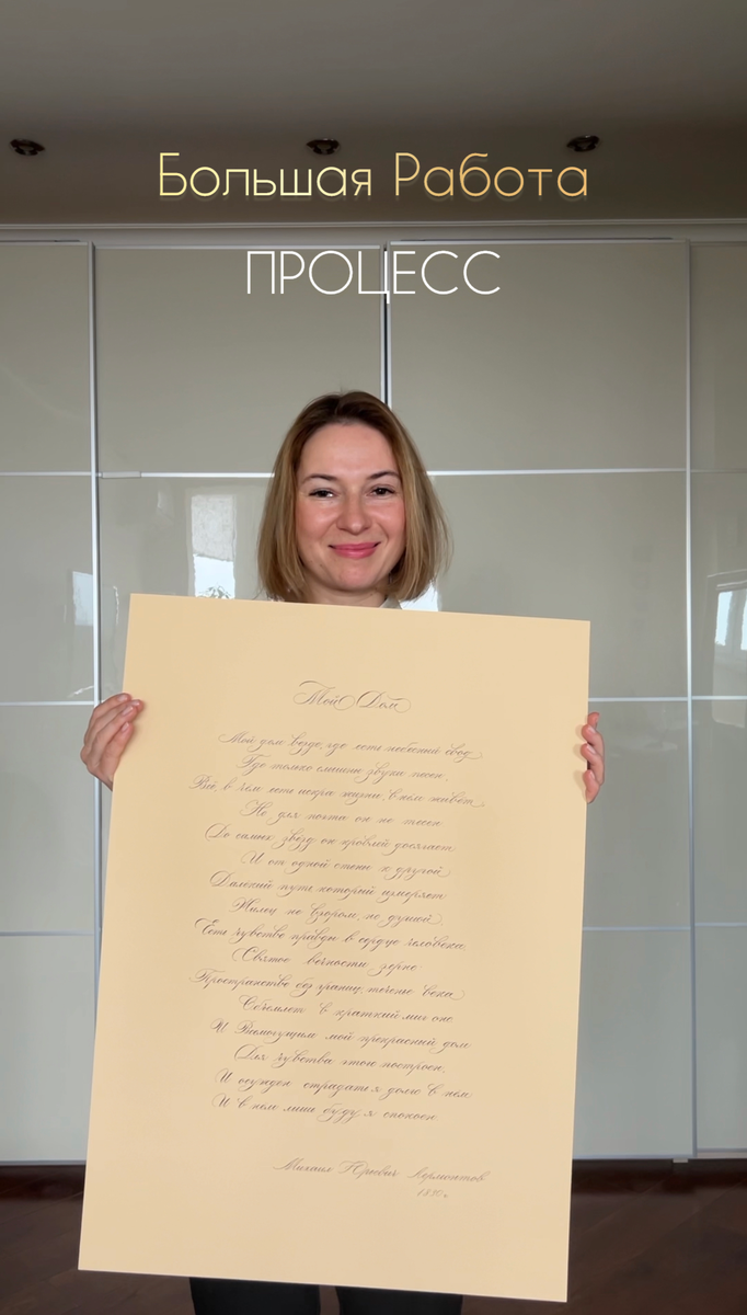 Пошаговая инструкция 1. Сделать «прототип» вашей работы - взять обычный лист - я склеила несколько листов офисной бумаги для получения нужного формата 2. Посчитать строки, которые вы планируете написать 3. Сделать поля - минимум 2 см по каждому краю 4. Сделать разметку для текста, начать можно с середины вашего формата, двигаться наверх и вниз, пока не получится нужное количество строк - так ваш текст окажется посередине всего листа 5. Сделать набросок текста, карандашом, выписывая буквы так, как если бы вы писали пером, не уменьшать расстояние между буквами 6. Проверить, всё ли нравится - межстрочные промежутки, завитки, пересечения линий. Если что-то выбивается из общей картинки, поправить. 7. Перенести все замеры на чистовик, можно замерять по линейке, где должен начаться текст на каждой строке, чтоб было удобно. 8. В идеале - написать текст карандашом на чистовике, но можно и без этого . Наслаждайтесь! Если дочитали до этого места, не забудьте поставьте лайк, мне будет п
