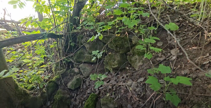 Всем привет. Порой натыкаешься на такие места, которые вызывают множество вопросов, на которые нет ответа. Оттого эти места кажутся жутковатыми. Вот и сегодня я наткнулся на такое место, хотя и сам поиск вышел довольно интересным. Начался банально - я проезжая через лесок увидал небольшой овражек в который решил спуститься: В нем я увидел, к своему легкому изумлению остатки довольно могучих стен. Явно не новых: Делили они овраг на несколько секции. Назначение - не известно. Расчехлил металлоискатель и погнал искать. Ничего существенного кроме фонарика и монетки не нашел: Но место пометил, как перспективное - на осень. Когда трава упадет... Решил углубиться в лес. И бам! Натыкаюсь на остатки строения, вокруг которого валяется пара десятков противогазов: И их явно давно не трогали! Само строение похоже больше на какую-то контору: Построено капитально. Их блоков. Крыша обвалилась вовнутрь. И снова - везде противогазы. Много! Тоже там-же нашел солонку: Назначение этого обвалившегося сооруж