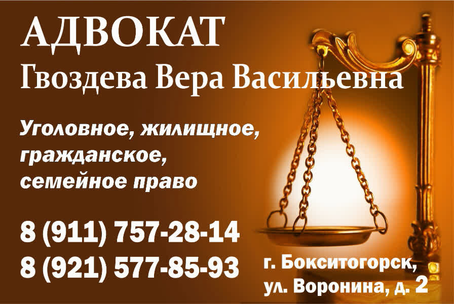 Адвокат Гвоздева Вера Васильевна окажет квалифицированную юридическую помощь и защитит Ваши права в суде. Уголовное, гражданское, семейное, жилищное право. Ленинградская область, г. Бокситогорск, ул. Воронина, д. 2 Тел.: 8 (911) 757-28-14 Тел.: 8 (921) 577-85-93 E-mail: veragvozdeva92@yandex.ru. Время работы: с 9 до 17 часов с понедельника по пятницу.