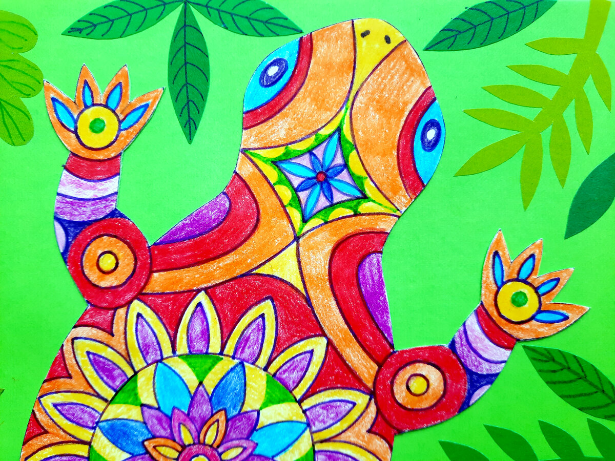 Эта работа в смешанной технике, где сочетаются аппликация с графикой. Основные задачи в этой работы: придумать интересный декоративный узор на ящерице и работа с цветом.