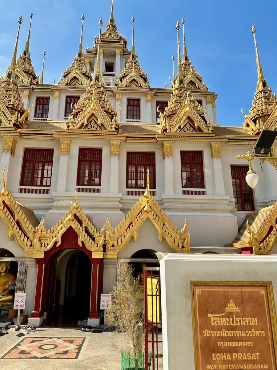 Мы обнаружили можно сказать случайно. Мы прокатились на лодке по каналам Бангкока, вышли на ближайшей остановке к нашему пункту назначения – Каосан роуд, и сразу наткнулись на красивый ансамбль из зданий, в котором опознали храм. Это был Ват Ратчанадарам, и мы решили туда зайти. Ват Ратчанадарам был построен В 1846 году по приказу короля Рамы III в честь принцессы Соманас Вадханавади, поэтому его название дословно переводится как «внучка короля». Выглядит он необычно для буддийского храма, потому что прообразом для строительства выступил утраченный ныне цейлонский храм III века до нашей эры. Главное здание храма – Железный дворец. Он действительно железный, это единственный металлический храм в Бангкоке. Впечатляет он своими 37-ю шпилями и крышами, которые символизируют 37 добродетелей, ведущих к просветлению. Внутри Железный дворец напоминает лабиринт с винтовой лестницей, по которой можно подняться наверх и посмотреть на храм и крышу сверху. На каждом этаже есть статуи Будды, истори
