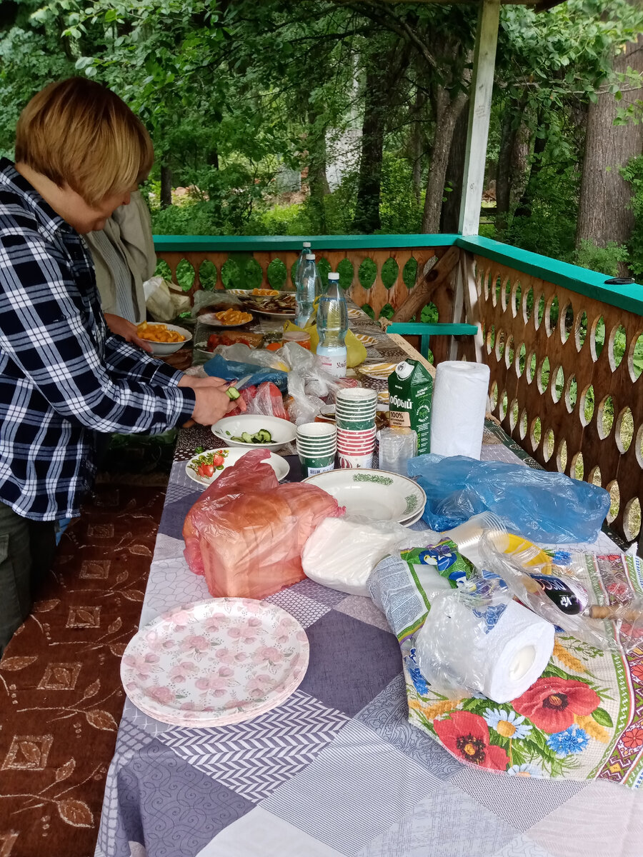 пятница 07.06.24 На сегодня планировалась поездка от работы на мероприятие в Ульяновск, со своими детьми. Но её перенесли на субботу. На завтра выходной отменяется, но на понедельник можно взять выходной, что я и сделала. Можно было не брать, ведь 25 июня опять отпрашиваться на выпускной. Сегодня у одной из сотрудниц была память отцу, она нас угощала. Сделала чак-чак, конфеты и фрукты принесла. Чай пили в 10:30. В 12:30 поехали в дендропарк, он расположен рядом, лишь спуститься по крутой тропинке, но у нас много пакетов, поэтому поехали на машинах и я на своей в том числе. А это в объезд, через всё село. Дождь пошёл ещё до обеда, всё гремело и сверкало, но нам ведь нипочем непогода. Человек 15 нас было, праздники здесь отмечаются дружно. Место красивое, была тут пару раз и с детьми приезжали погулять. Это нижний дендропарк, а есть верхний, но там закрыто, детей в лагерь привозят. В 2016 году сюда приезжали, сейчас указатели поменяли. Посидели, песни пели, музыку включали, по