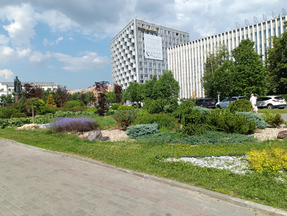 Не правда ли, яркой выглядит композиция в сквере Даниловской площади?! А ведь здесь ещё почти ничего не цветёт. Всё это разнообразие оттенков достигается за счёт цвета листвы и хвои. Конечно же, свою лепту в живость панорамы вносят размеры и форма растений, их сочетание. В итоге имеем жизнерадостную картинку, которую так и хочется рассмотреть поближе. Я уже писала однажды об этом месте, преображённом не так давно, и выкладывала фотографии, но это было осенью. В начале лета площадь выглядит иначе, да и растения подросли за это время. Территория, занятая декоративной композицией, большая, а из цветущих растений пока только ирисы ( на фото вверху) и котовник в тех же тонах (на фото ещё выше). Правда, цветёт ещё Heuchera, но это зрелище не слишком впечатляющее. Спирея пока только имитирует цветение молодыми листочками, но какая живая картинка из-за наличия краснолистных деревьев и растений с хвоей самых разнообразных оттенков! А вот то, о чём я говорила выше. Красивая композиция и сочет