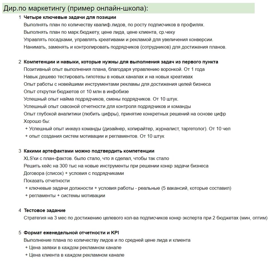 Директор по маркетингу Вы должны понимать, что каждый подрядчик, которого вы привлекаете, учится на ваших деньгах и тратит ваши тестовые бюджеты. Компетентность вашей компании критически влияет на результат, как тестовых периодов, так и фактической работы подрядчика. У вас есть 2 пути: самому стать компетентным директором по маркетингу или нанять компетентного в этом вопросе человека, у которого есть база подрядчиков и наработки. Который сможет вам обеспечить нужное количество заявок по допустимой цене. Пусть вас не пугает слово директор в должности, это обычный сотрудник, который прошел огонь, воду и медные трубы. Главное в системе мотивации — привязать такого специалиста к выполнению плана и не давать большую фиксированную часть зарплаты. Первым шагом необходимо создать профиль должности директора по маркетингу и прописать, какие функции он должен выполнять. Предлагаю вам воспользоваться специальным шаблоном с примерами профилей на разные должности. Советую потратить один час времени