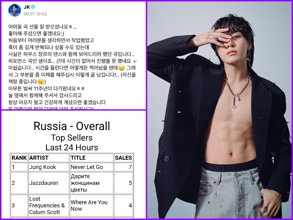 Вчера рекорды, сегодня рекорды. Как обычно). Так еще и от Apple Music вышла фотография в честь релиза. Не знаю как вы, но я глядя на это фото вспоминаю фотосессию с Calvin Klein. Трек "Never Let Go" возглавила чарт iTunes в 70 странах мира всего за 2 часа 17 минут!!! Тем самым став песней, которая быстрее всех это сделала. Но забываем, продолжать стримить. И к тому же, песня песня добралась 1 места в российском iTunes. Чонгуки даже пришел к нам на Weverse, чтобы оставить сообщение. Несмотря на то, что он в армии, он находит время к нам заходить. "Арми вы получили в подарок мою песню, хех....