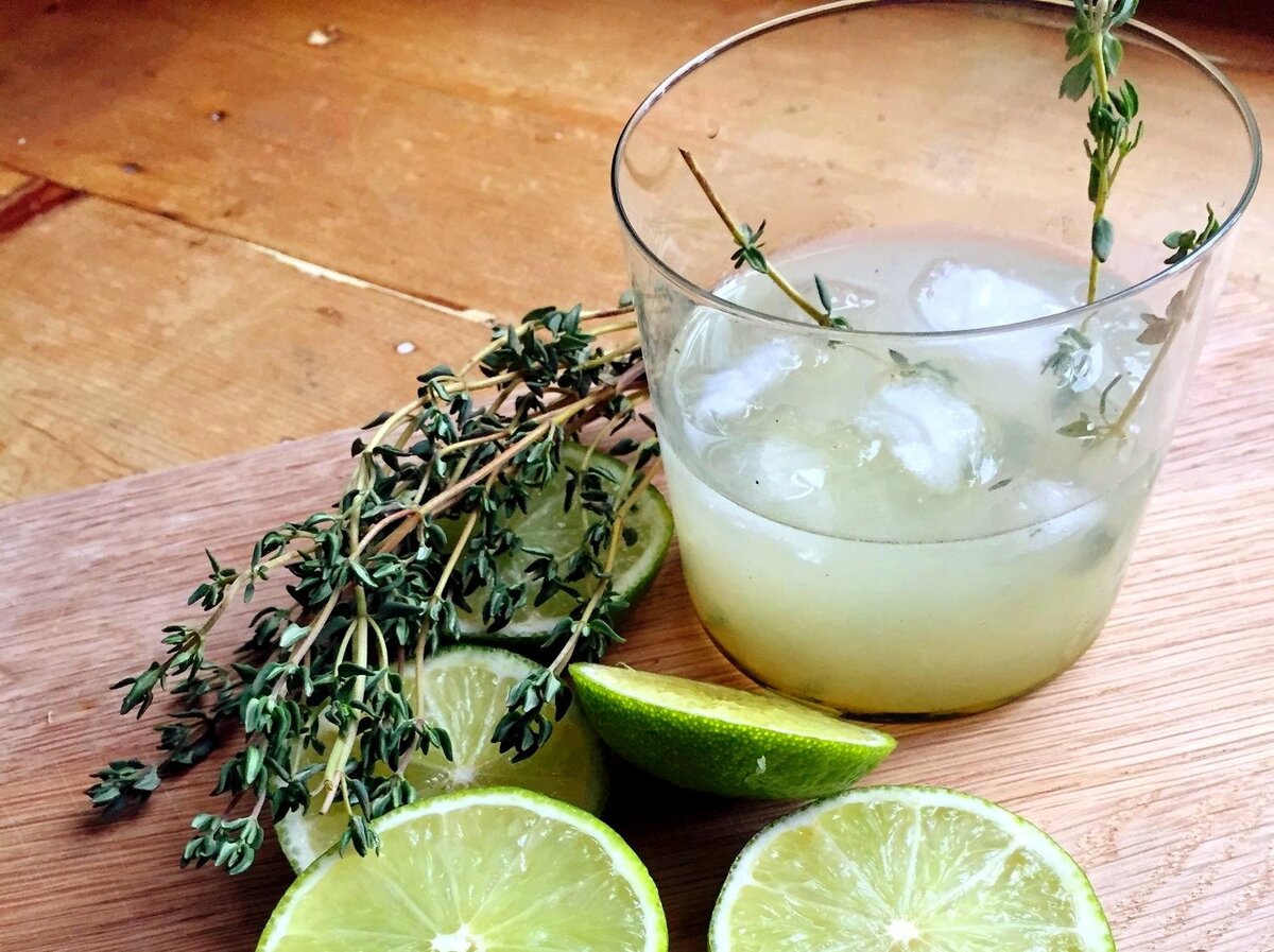 Веточки разогрейте над огнем до появления аромата и легкой обугленности лепестков. В шейкере смешайте тимьян и сок лайма. Затем добавьте лед, остальные ингредиенты и энергично встряхните несколько раз. Перелейте в охлажденный стакан со льдом, украсьте тимьяном.