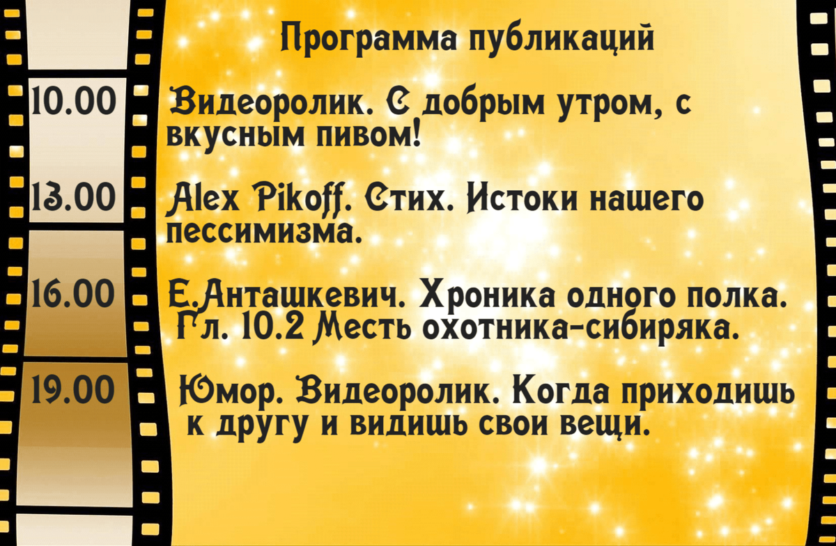 ====================================================== 1. Программа публикаций ====================================================== 2. Интересное из архива. 1. "Чайка Гиперборейская" юмористический рассказ от Bond Voyage. В городах на голову может упасть производное голубей. На Севере голубей нет. Там обитают большие и гордые птицы бакланы или по-научному "Чайки Гиперборейские". Вот кого стоит опасаться. 2. Видеоролик. Высказывания знаменитых людей об алкоголе, женщинах, застольных беседах. ===================================================== 3. Мультанекдот "Грехи молодости". ===================================================== Хорошего дня! Ваш Bond Voyage.