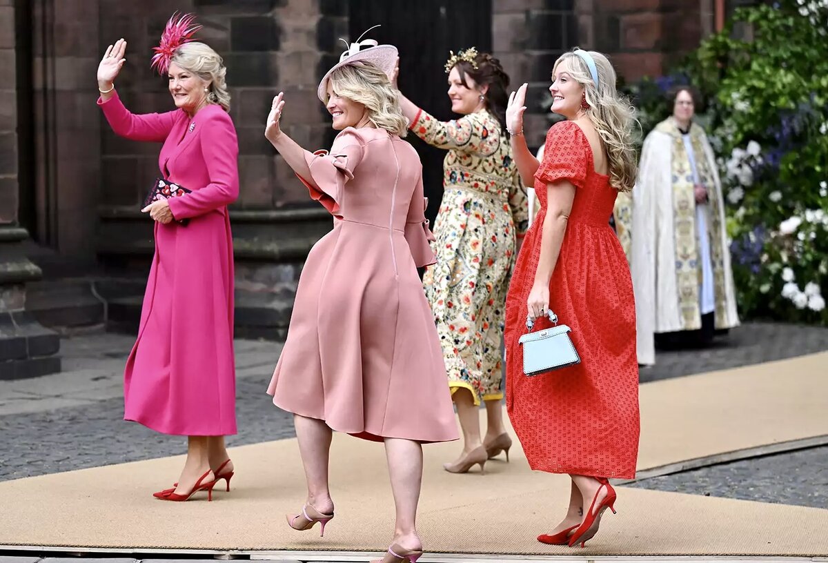 Продолжаем рассказ о вчерашней свадьбе Хью Гросвенора и его Оливии. Гости прибыли в Честерский собор в пятницу на свадьбу герцога Вестминстерского и Оливии Хенсон на торжество, которое уже было названо свадьбой года в Англии. Среди участников были принц Уильям и графиня Личфилд, а также друзья пары из университета и школы. Сейчас хочу обратить внимание на сами наряды гостей и родственников. Хотя и толпа зевак вызывает интерес. Кто-то даже завернулся во флаги… И начнем мы не с невесты( ее мы обсудили, здесь и здесь) а с сестер Хью! Сестра Хью, леди Эдвина, сочетала свое бледно-розовое платье от Roksanda с цветом галстука своего мужа Дэна. Она надела мюли от Malone Souliers. Леди Виола, вторая сестра жениха, выбрала красное платье в горошек Selected Femme и бледно-голубую сумку Fendi. Ободок, как и шляпка у сестры, от Emily London. Она носила туфли-лодочки Aquazurra. Люси Штраубензи выбрала голубоватое со стальным оттенком платье с высоким воротником с оборками и п