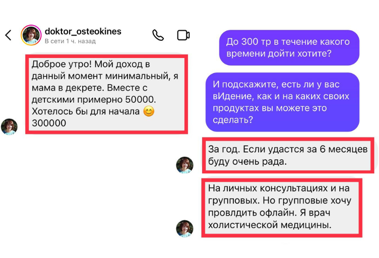 Цель Наташи - в течение 6-12 месяцев выйти на доход 300.000 р. Это наша с ней предварительная переписка ⤵️