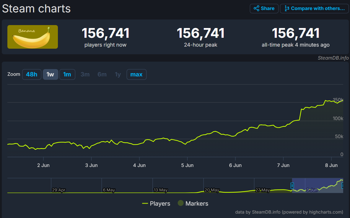 Banana – бесплатный кликер в Steam, пиковый онлайн которого уже превысил 150 тысяч. Сейчас игра влетела в топ-6 чарта Steam, обогнав Rust, GTA 5 и Elden Ring. В этой статье разбираемся, что это за игра и можно ли на ней заработать. Все играют в Hamster Kombat – кликер, где обещают реальные деньги. Что за игра и можно ли заработать? Как заработать больше монет в Hamster Kombat В чем суть игры Banana Весь геймплей заключается в том, чтобы кликать на банан. За это вы получаете бананы в свой инвентарь Steam. Для этого вам нужно заходить в игру раз в 3 часа и кликнуть хотя бы 30 раз или просто подождать минуту. Раз в 18 часов вам будет доступен редкий банан, он упадет вместе с обычным. Можно ли заработать Самый обычный банан стоит 4 копейки, стоимость редких начинается от 1 рубля. После того, как вы получаете банан в свой инвентарь Steam, вы можете его продать на торговой площадке. Общее количество бананов на ТП уже более миллиона. Редкие бананы стоят намного дороже. Например, Starynana, ве