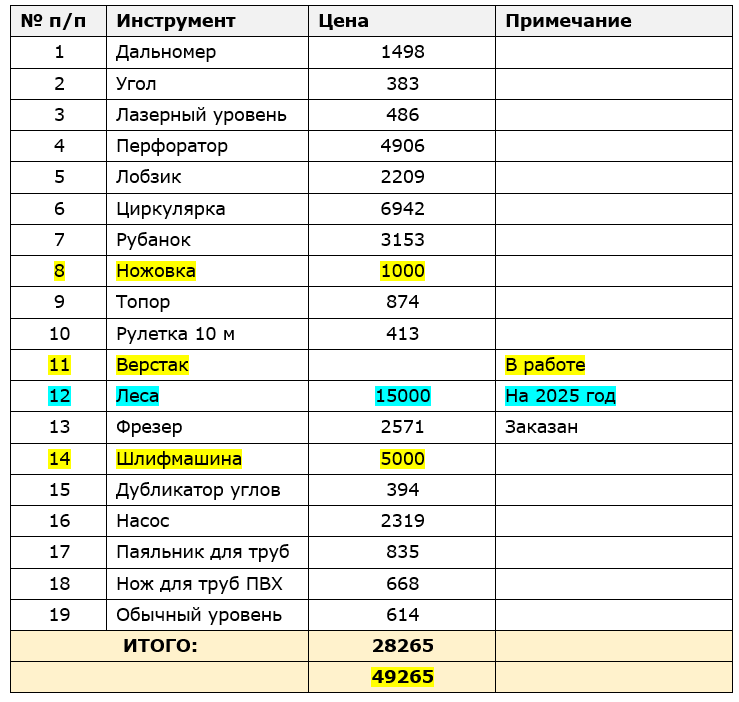 На всякий случай сразу скажу, что я не строитель, и не плотник. Поэтому просьба не кидать в меня тухлыми помидорами ))) Этот верстак я сделал по принципу “художник так видит”. С другой стороны, сделал я его почти по всем правилам инженерии - с чертежами и моделированием (ну просто так захотелось))). Так что может эти чертежи кому-нибудь да и пригодятся. Хотя бы для того, чтобы взять их за основу. Я уже писал, что достраивать дом буду сам. Почти весь необходимый инструмент закупил. Кстати, если кому любопытно, то вот список: Жёлтым выделено то, чего ещё нет. Большую часть инструмента я уже опробовал. Так что в следующих статьях расскажу подробнее. А верстак решил сделать сам. Поскольку работать с деревом придётся довольно много, то верстак необходим. Я не стал лазить по интернету в поисках готовых решений (мы не ищем простых путей))). Потому как захотелось сделать самому, а заодно и опробовать кое-какой инструмент (циркулярку и лобзик, например). Ну а модель создал сам. Благо что у меня