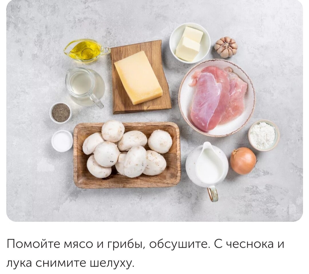 Мы приготовим нежную индейку во вкуснейшем сливочном соусе с грибами, которую полюбит вся семья! Для блюда Индейка 700 г Оливковое масло 2 ст. л. = 34г Сливочное масло3 ст. л. = 60 г Репчатый лук0.5 шт. = 40 г Чеснок4 зубчик = 20 г Шампиньоны 300 г Пшеничная мука хлебопекарная2 ст. л. = 50 г Бульон 0.5 стакан = 100 г Молоко 1 стакан = 200 г Пармезан50 г Соль по вкусу Черный перец молотый по вкусу Для подачи Картофельное пюре по вкусу! Приятного аппетита! )