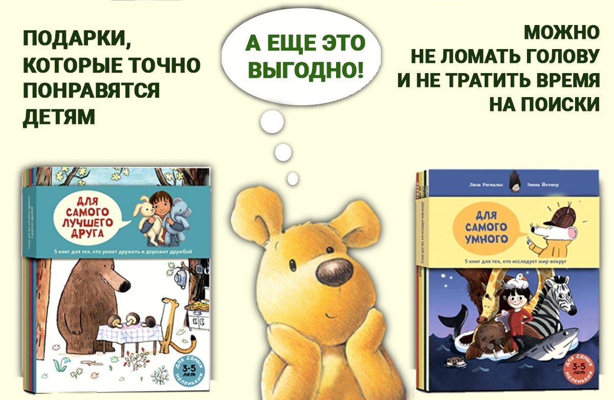 И для тех, кто любит подумать, и для тех, кто любит добрые истории, и для тех, кто обожает разглядывать милые картинки... Да, в нашей серии "Для самых маленьких" наконец-то вышли подарочные комплекты детских книг! 1) Для самых маленьких, чтобы читать всей семьей - комплект "Подарок малышу". Он подойдет, если вы не знаете интересы ребенка, только его возраст: 2-5 лет. 5 милых книг точно понравятся малышу: «Как Анастасия спасла Бенжамина», «Скорая помощь доктора Мышкина», «Живой орех», «Летний день с друзьями», «Утиная каша». Эти теплые истории прекрасно подойдут для моментов, когда любимые родители или бабушка с дедушкой читают малышу на ночь. «Утиная каша» покажет, как важно радоваться новому и давать ему шанс, «История о том, как Анастасия спасла Бенжамина» расскажет, как не бросить друга в беде, «Скорая помощь доктора Мышкина» продемонстрирует, как заботиться о других и быть смелым, «Летний день с друзьями» откроет, как найти счастье в мелочах, а «Живой орех» научит договариваться и