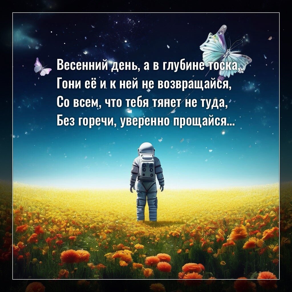 Весенний день, а в глубине тоска, Гони её и к ней не возвращайся, Со всем, что тебя тянет не туда, Без горечи, уверенно прощайся. Ни люди, ни заботы, ни места Тебе, запомни, не принадлежат, Ты можешь о прошедшем тосковать, Но это не вернуть уже назад. И ты другой, и всё уж поменялось, Но только мысли в голове о том же, Пора сменить и их, не пожалеешь, События иначе будут схожи. Когда вокруг нет ни одной Души, Что твоё сердце теплотой согреет, Она, вместо того, чтобы расти, Отчаянно и искренне болеет. А время ведь дано не для того И декорации сменяются специально, Чтоб совершил свой квантовый прыжок, Терять любимых - это ненормально, Но только так Душа твоя растет, Лишь так в свою ныряешь глубину, Не пробуя в других себя искать, Тебя там нет, не надо плыть ко дну, Плыви на свет, на солнечный заряд, Он есть в тебе и в промысле Творца, Не думай никогда, что ты один, Иди с улыбкой в жизни до конца.