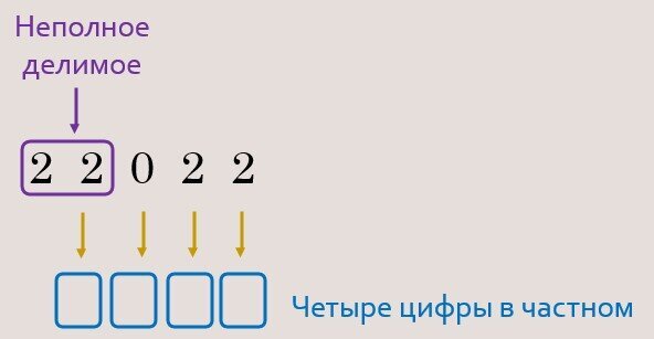 Одним из сложных случаев деления для детей является случай с нулем в частном. Многие взрослые часто дают неверный ответ. Попробуйте выполнить деление 22022 : 11. Какое частное у вас получится? А) 22 Б) 202 В) 2002 Г) 2020 Д) 20 002 Однажды мне был дан такой ответ от студентки: 22. Обоснование: а ноль не считается! Считается, и даже не один. Прежде, чем выполнять деление с детьми, рекомендую сначала находить количество цифр в частном. Находим первое неполное делимое: 22 делится на 11 и при делении получится двойка. Это и будет первая цифра в частном. В делимом останется еще 3 цифры и столько же ещё цифр будет в частном. Значит, всего в частном четыре цифры. Ниже привожу шпаргалку, чтобы проще было понять, откуда же здесь взялось 4 цифры. После того, как мы узнали, сколько в частном цифр, мы уже без труда можем найти верный ответ: 2002. Конечно, тут не может быть в ответе 2020, так как делимое 22 022 и делитель 22 — некруглые числа, а, значит, при делении круглого в частном тоже не будет