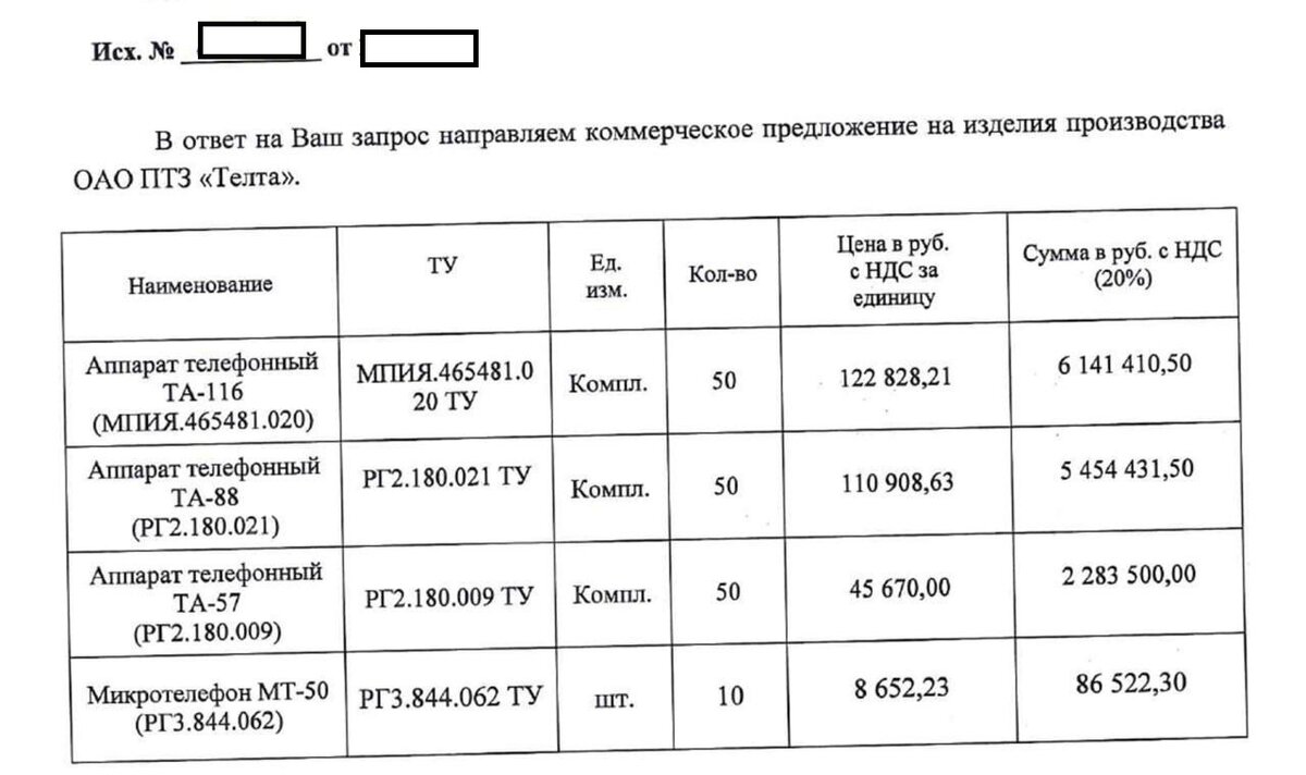 "Стоял на дальней вышке на посту. Зима, ветер. Но тулуп был положен. Начкар, если что: "Дзынь, дзынь...". Аппарат под голову и два часа на массу. Хороший телефон ТА-57". /Илья Р./ Товарищ Александр в "Телеге" скинул мне прайс-лист с комментарием: "Однако цены!". Увидел цены, и как бывший связист, озадачился. Телефонные аппараты с маркировкой ТА - 116, ТА - 88, мне ничего не говорили. "Но ТА-57! И стоимость 45 670 рублей!". Из золота делают... Посмотрел в сети. Телефонный аппарат ТА-116 с номеронабирателем стоит ещё больше чем в прайс листе от товарища. "152 963 рублей 46 копеек с НДС". Работает как в двухпроводном, так и в четырехпроводном режиме. В сетях специальной связи и с питанием от центральной батареи. Полевой переносной телефонный аппарат ТА-88: Стоимость 140 092 рублей 22 копейки с НДС. Тот же ТА-57. Только при отсутствии батареи питания ведение разговора обеспечивается индуктором нажимного типа. А вот цена старого армейского полевого переносного телефонного аппарата ТА-5