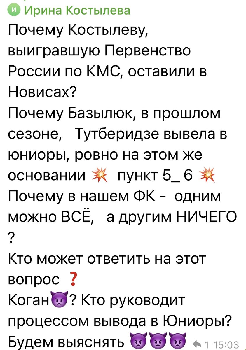 Ирину Костылеву вновь понесло. Думала, что после перехода в «Ангелы Плющенко» мама немного успокоится и несколько месяцев мы проживем без сенсаций. Самое грустное, что Ирина оскорбляет других детей. Про свою дочь Лену можно рассказывать сколько угодно, но другие фигуристы. Несовершеннолетние дети, на минуточку. Сейчас Ирина переживает, что в следующем сезоне Лену не допустят до юниорских этапов Гран-при. Риту Базылюк год назад допустили, а вот Лену не хотят. В команде Этери Тутберидзе ту же Лизу Андрееву не допустили до этапов, так как она не прошла по возрасту. Что значит, одним можно все? Мама пошла в атаку и собирается писать письмо Сихарулидзе :) А дальше можно и отправиться за океан, раз Леночку так не ценят и задвигают. В Америке Лену прямо ждут. Кстати, за океаном тренировки платные даже для членов сборной команды. Никто так не поддерживает фигуристов, как в сборной России. Уж точно сборной США такая непростая мама не нужна. При всем таланте Лены и перспективах. Ирина часто го
