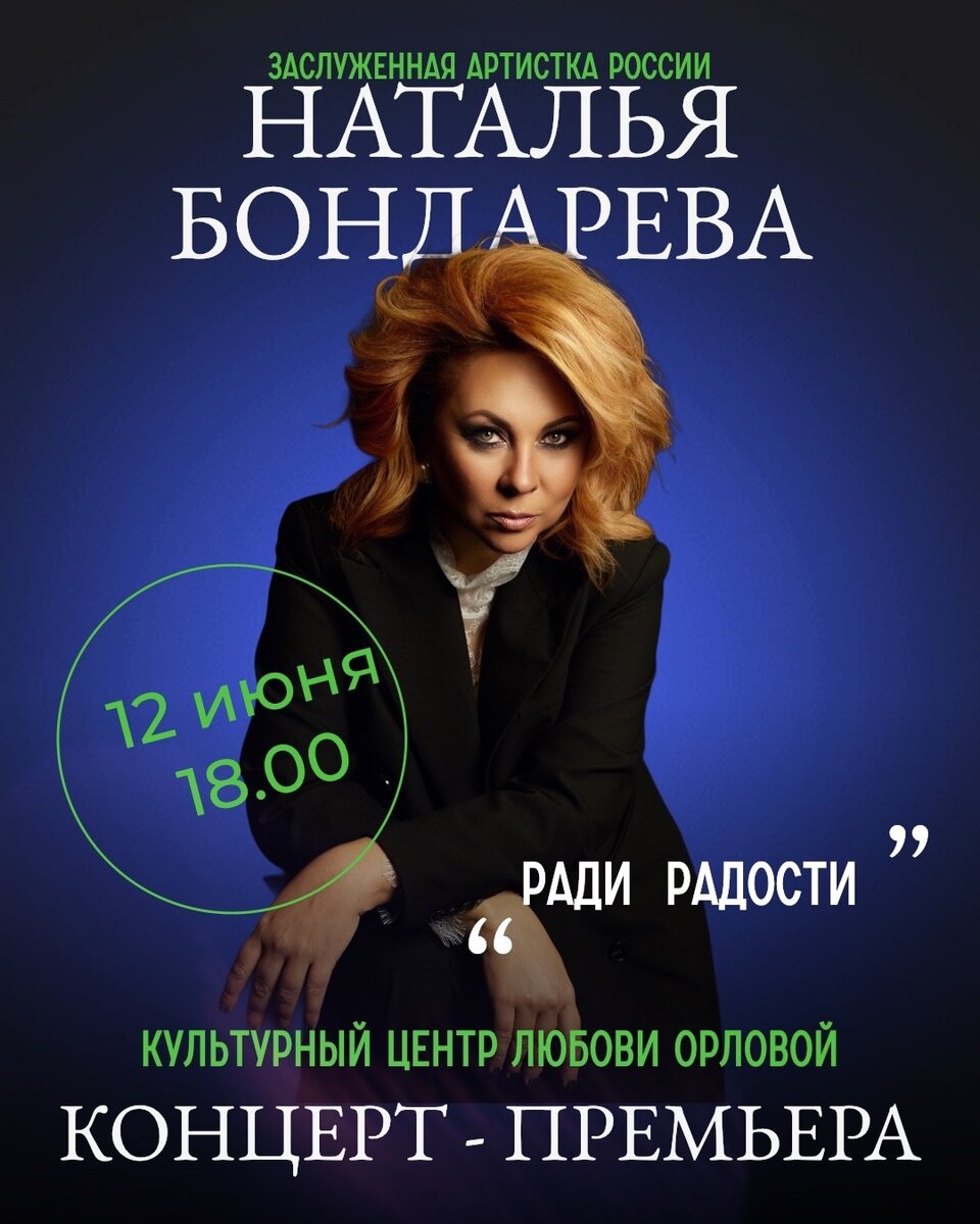 Дорогие друзья! Приглашаю вас на мой сольный концерт «Ради Радости» с новой музыкальной программой - это большая премьера! К работе над музыкальным материалом были привлечены лучшие музыканты, аранжировщики, саундпродюссеры и медиаменеджеры. Креативным продюсером новой программы выступил Вадим Антонов, он же является автором 4х новых песен. С нетерпением жду встречи с вами 12 июня в 18.00 в Культурном центре Любови Орловой в городе Звенигород. Праздничный концерт в честь Дня России организован при поддержке администрации Одинцовского городского округа. Вход свободный. #НатальяБондарева #ВадимАнтонов #концерт #музыка #премьера #РадиРадости #ДеньРоссии #КультурныйЦентрЛюбовиОрловой #Звенигород #Одинцово