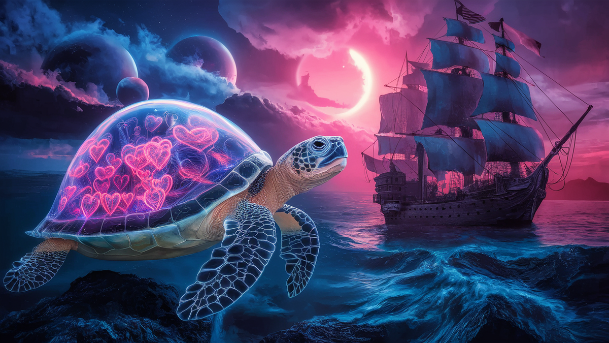 Погружение в Сюрреализм: Волшебные Закаты, Черепахи с Сердцами и Пиратские Приключения от Нейросети ideogram