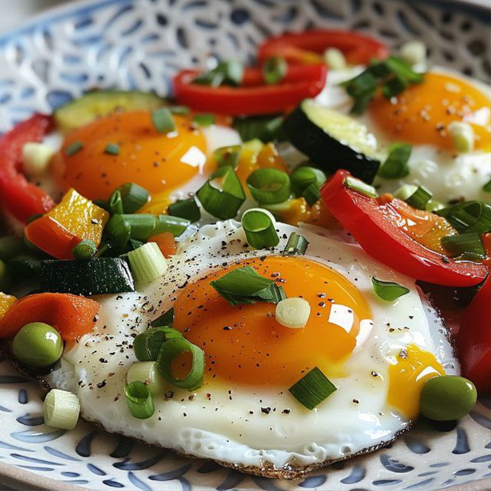 Яичница с овощами Ингредиенты: яйца, помидоры, шпинат, сыр, соль, перец.