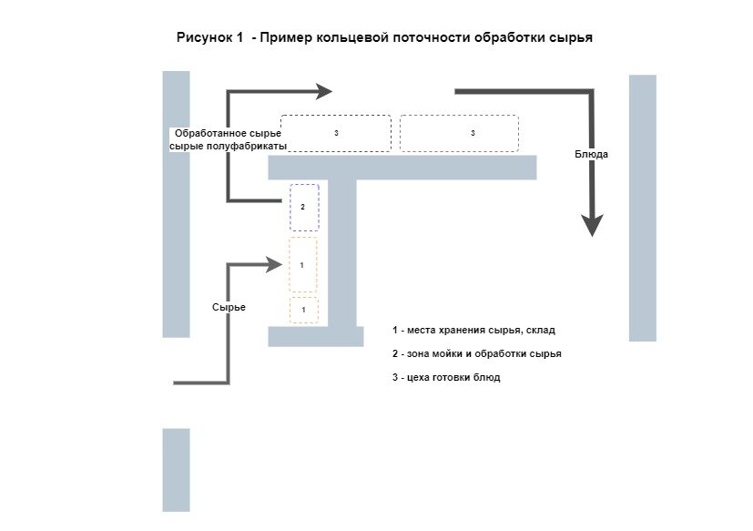 Самым важным условием для выполнения принципов поточности и цехового деления является то, что необработанное сырье абсолютно не должно попадать в цеха, предназначенные для приготовления пищи. Это первостепенная мера предосторожности, направленная на обеспечение безопасности и гигиены. Чтобы соблюсти этот принцип, для сырья первоначально следует предусмотреть специальную зону приемки. Это место, где сырье будет приниматься и осматриваться перед тем, как его отправят на дальнейшую обработку. После зоны приемки следует зона обработки, где сырье подвергается мытью и другим формам обработки для его очистки и подготовки к использованию. Только после того, как сырье было тщательно помыто и очищено, оно может быть направлено в цеха на рабочие столы. Это гарантирует, что все продукты, которые приходят в контакт с пищей, находятся в гигиенически чистом состоянии. Примерная схема движения сырья от зоны приемки до рабочих столов в цехах показана на рисунке 1.