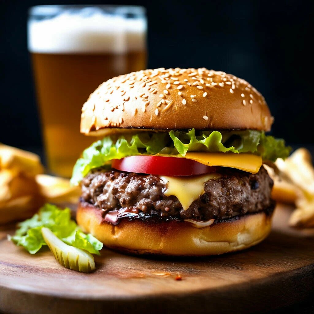 Рецепт чизбургера (на 2 порции): Ингредиенты: * булочки для бургера — 2 шт.; * фарш говяжий — 400 г; * помидор — 60 г (1 шт.); * огурцы маринованные — 50 г (2 шт.); * лук репчатый фиолетовый — 40 г (1 некрупный); * сыр чеддер — 4 пластины; * листья салата — 2 шт.; * кетчуп — 4 ст. ложки; * горчица зернистая — 1 ч. ложка; * соль — 0,25 ч. ложки (по вкусу); * перец чёрный молотый — на кончике ножа (по вкусу); * масло растительное — 15–30 мл (1–2 ст. ложки). Приготовление: 1. В глубокую миску выложить говяжий фарш, добавить соль и молотый перец. 2. Сформировать из фарша две круглые котлеты высотой около 1,5–2 см. 3. В кетчуп добавить горчицу в зёрнах, тщательно всё перемешать — соус готов. 4. Лук очистить, вымыть и обсушить, нарезать кольцами и разобрать их. 5. Маринованные огурцы нарезать пластинами. 6. Пластины сыра освободить от упаковки, листья салата промыть и обсушить. 7. Булочки для бургеров разрезать пополам, подсушить на сковороде гриль несколько минут до румян