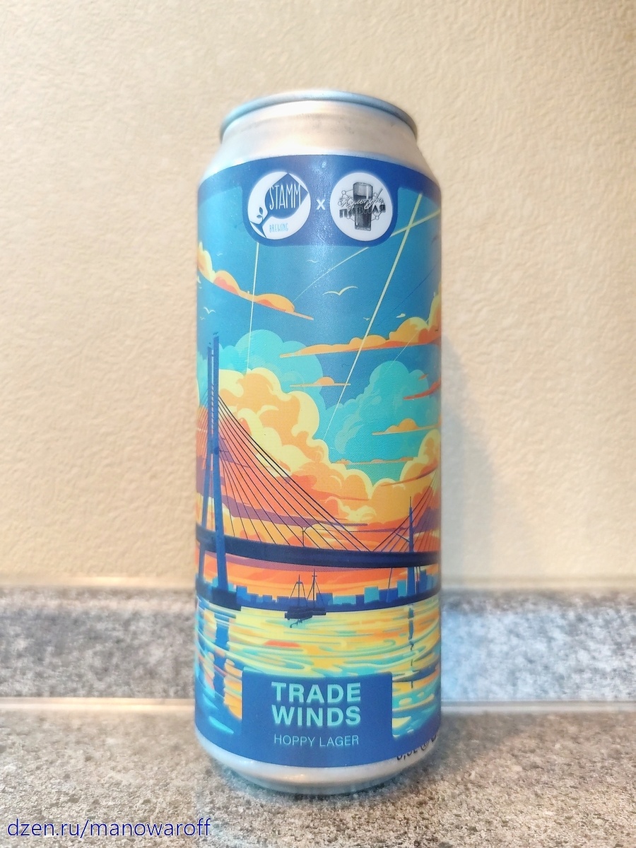 Сегодня заценим новинку под названием Trade Winds от пивоварни Stamm Brewing, как можно было догадаться по заголовку. Ну как новинку... Появилось это пиво в конце апреля. А попробовал я его примерно через полтора месяца после розлива. Срок годности составляет 365 суток при хранении в холодильнике. Как ни странно, но это не мутняк, коими славится данная пивоварня, а охмеленный лагер. Что ж, такое я тоже люблю. Глянем описание и приступим к дегустации: Свежий, ароматный лагер, охмелённый Motueka. Сварен в коллаборации с нашими друзьями - bottleshop Культура Пивная из Владивостока. ТТХ: Пиво золотистое, прозрачное. Пены не особо много, стойкость средняя. Аромат не очень яркий, цитрусово-травянистый. Во вкусе солод, цитрусы и мягкая травянистая горечь. Послевкусие цитрусовое, горьковатое, слегка вяжущее, сухое. Пиво полнотелое и очень питкое. Отличный лагер получился. На девяточку. В магазине "Беру выходной" это пиво отдают за 280 рублей. Продегустированное пиво от пивоварни Stamm Brewing