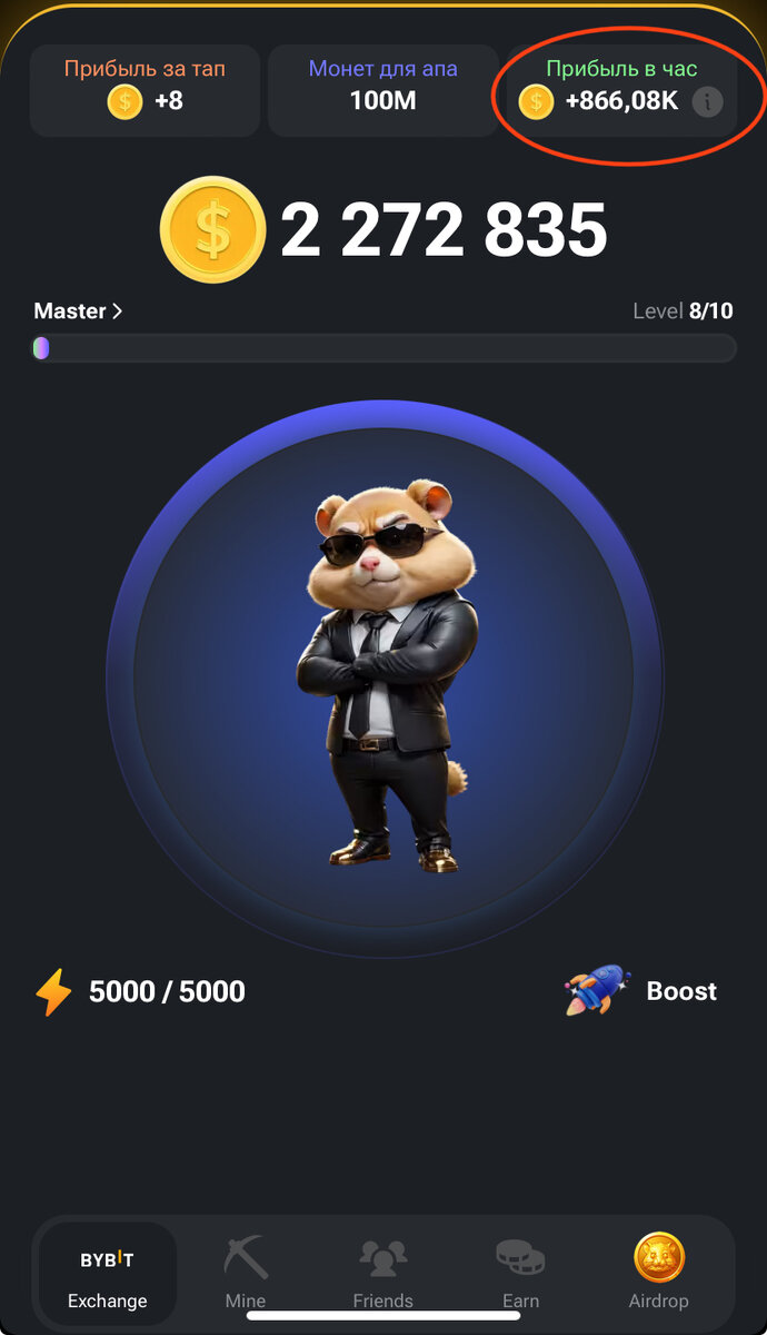ЧТО? Hamster Kombat - мини приложение внутри телеграмма. Фактически это игра, в которой ваша цель, собирать монеты. ЗАЧЕМ? Популярность игры строится на предвкушении листинга (выход монеты на криптобиржу). Представьте, что вы просто тапали на экран в свободное время, а потом ваши миллионы монет обретают реальную стоимость. Фактически после листинга вы можете вывести деньги на свои обычные физические карты. Заработать 20,50,100+ т.р. КАК? Заходите в игру и давайте разбираться. 2 уровень - 5000 монет 3 уровень - 25000 монет 4 уровень - 100000 монет 5 уровень - 1 млн 6 уровень - 2 млн и т.д. К примеру, я могу не заходить в приложение 3 часа (3 часа-лимит пассивного дохода) и за каждый час мне начислят 866 000 монет. Разработчики также рекомендуют не только копить монеты на своем счету, но и увеличивать пассивный доход своей биржи. Вероятно это будет ключевым моментом при подсчете балансов пользователей перед листингом. Как прокачать пассивный доход в Hamster Kombat? В разделе