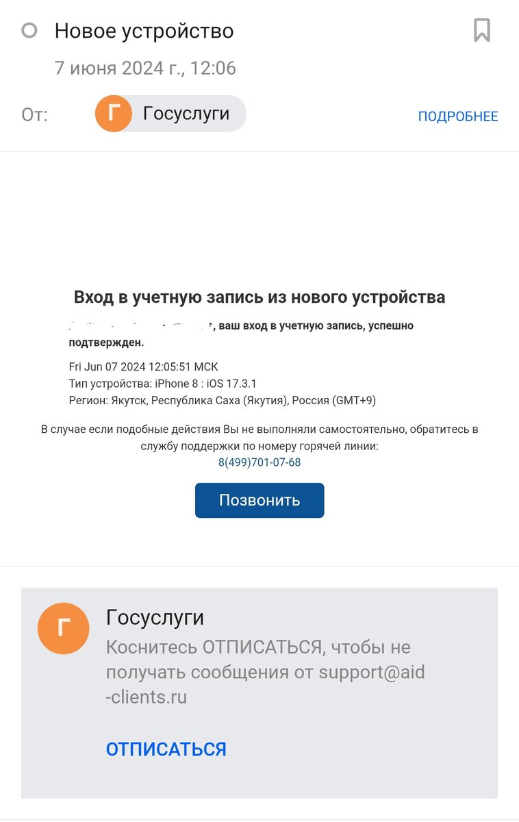 Буквально два дня назад я писала про звонки с незнакомых номеров. К этому все уже привыкли. Сейчас я вам расскажу ещё про два случая мошенничества, которые произошли со мной вчера, практически одновременно. Особенно один случай мошенничества был бы чреват для меня. Мошенники становятся всё изощрённее Мне на почту пришло электронное уведомление - письмо из Госуслуг. Я иногда так тороплюсь, и тут разволновалась. И в очередной раз убеждаюсь, что не надо торопиться, не надо совершать никаких необдуманных поступков. У меня же рука потянулась было сразу позвонить. Но тут я увидела в этом письме что-то подозрительное. Вот это уведомление. Вы что - нибудь заметили подозрительное? Я нет, вначале. Не часто же я получаю такие письма от этой организации. Решила проверить и сходила в Госуслуги. Оказывается, никто кроме меня туда не заходил. Стала изучать это уведомление и поняла, что это подделка. Разве Госуслуги так себя обозначают? Нет, конечно. Буква "Г"на жёлтом фоне это никакие не Госуслуги