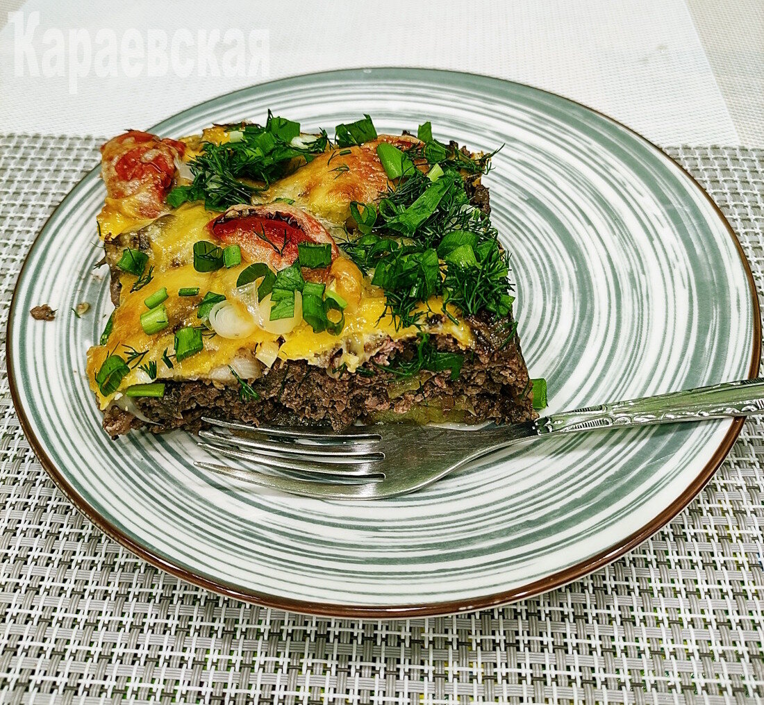 В форму для запекания выложить половину овощей. На них выложить ровным слоем фарш из субпродуктов. Сверху вторую половину овощей. Проложить помидорами.
