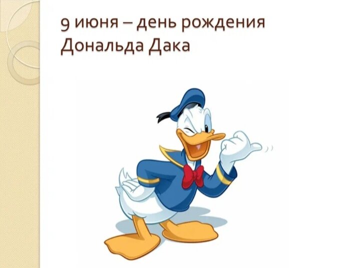 В США 9 июня отмечают Национальный день Дональда Дака. Пусть в других странах такого праздника нет, но это не мешает людям по всему миру поздравлять диснеевского персонажа, посвящать ему рисунки и пересматривать мультфильмы с ним. Дональд Дак — антропоморфный белый селезень в матросской рубашке с галстуком-бабочкой и кепке. Считающийся одним из величайших мультипликационных персонажей всех времен. Дональд Дак известен своей высокомерной, незрелой, озорной и темпераментной личностью, а также полуразборчивой речью, которая стала известна как "разговор Дональда Дака". 9 июня все поздравляют Дональда Дака с днем рождения, ведь именно в этот день он появился на экранах в мультфильме "Маленькая мудрая курочка" в 1934 году. Но во вселенной мультфильмов Дональд родился в другой день: 13 марта 1914 года. Об этом стало известно в одном из мультиков, вышедших спустя несколько лет после его дебюта. Несмотря на это, официальным днем рождения персонажа принято считать 9 июня. Впрочем, не пе