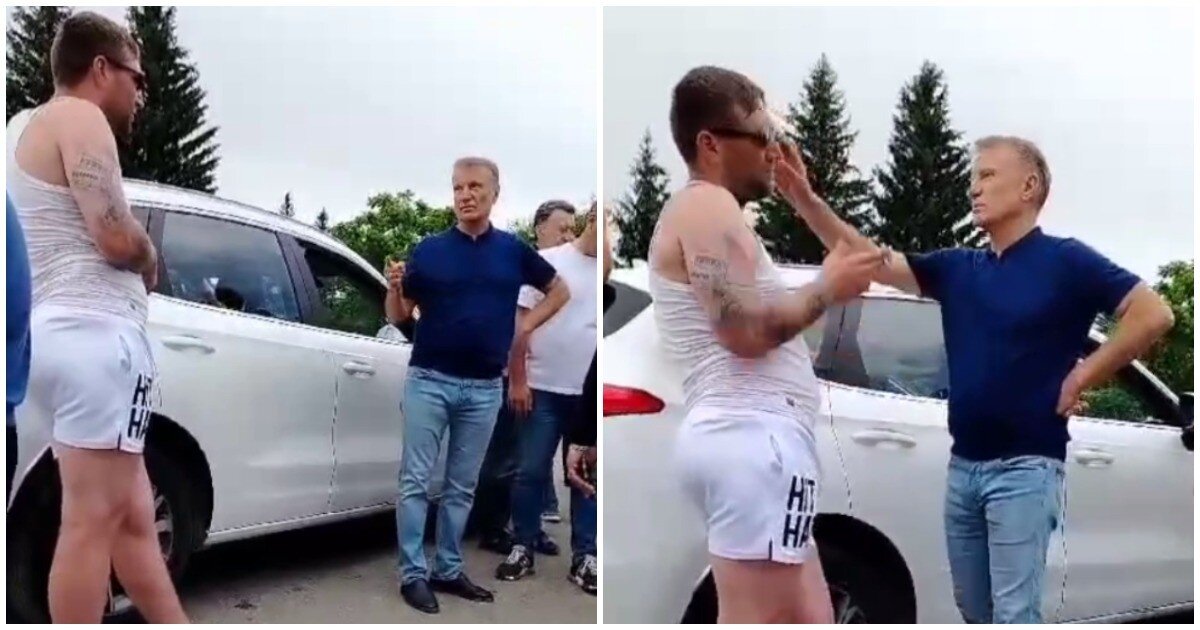 Однако Греф их не слушает, он называет собравшихся «бандой». «Вот что это такое? Посмотри на него», — показывает Греф на мужчину в шортах и тёмных очках.