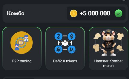 Привет, Котаны! Каждый день в 15:00 по московскому времени комбо карты в Хамстер Комбат меняются. При этом старое комбо уже не действительно, если вы не успели его собрать. Для активации комбо нужно купить все три карточки в любом порядке. И сегодня это: 1. Hamster Kombat merch (Мерч Хамстер Комбат) – в разделе Specials 2. Defi 2.0 tokens – в разделе Markets 3. P2P Trading – в разделе Markets Соберите их в игре, чтобы получить бонусные пять миллионов игровых монет. Следующее комбо будет 09.06 в 15:00, в целом, они появляются каждый день в это время, а сегодня какие новые три карты надо было покупать в комбо в хамстер комбат.