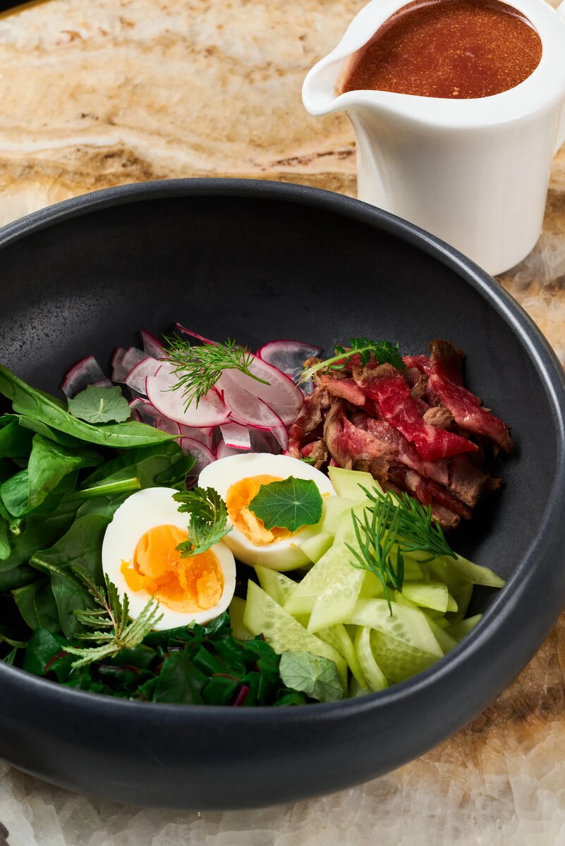 Как и обещал, сегодня хочу рассказать вам об одном удивительном блюде старинной русской кухни — ботвинье. Этот холодный суп, освежающий и полезный, с легкостью украсит ваш летний стол. Но сначала давайте окунемся в историю его появления. Ботвинья пришла к нам из древней Руси. Название супа происходит от слова «ботва», что значит зелень, ведь основными ингредиентами этого блюда были молодые листочки и стебли свеклы. В то время ботвинья считалась едой простых крестьян, которые готовили её из того, что могли найти на своих огородах. Однако со временем суп прижился и на столах знати, став одним из излюбленных летних угощений. И вот, спустя века, ботвинья возвращается к нам в новом, современном прочтении, но я, безусловно, сохранил все лучшие традиции этого блюда и добавил немного изысканности. Ингредиенты: - Свекла с ботвой — 1 шт.(свеклу отвариваем, а ботву обдаем кипятком до мягкости) - Шпинат — 1 пучок - Яйцо — 1 шт. - Ростбиф — 3 ломтика (около 50 гр. на порцию) - Редис — 3 средние шту
