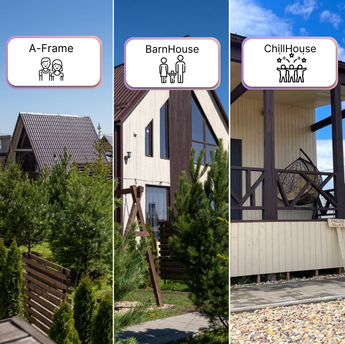 Третий вариант - Chillhouse. Это отличный выбор для компании от 2 до 4 человек. Здесь вы сможете расслабиться и насладиться общением с друзьями или близкими. В Chillhouse есть все необходимое для комфортного отдыха и проведения времени на свежем воздухе. Таким образом, в Pavlove Village есть разнообразные варианты размещения . Вы сможете выбрать подходящий вариант и насладиться прекрасным отдыхом на природе.