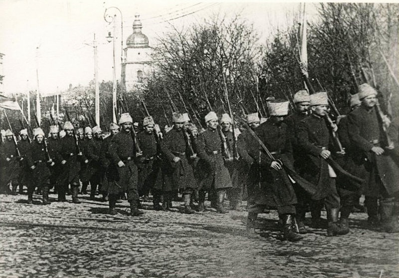 "...То не серая туча со змеиным брюхом разливается по городу, то не бурые, мутные реки текут по старым улицам — то сила Петлюры несметная на площадь старой Софии идет на парад. В синих жупанах, в смушковых, лихо заломленных шапках с синими верхами, шли галичане. Два двуцветных прапора, наклоненных меж обнаженными шашками, плыли следом за густым трубным оркестром, а за прапорами, мерно давя хрустальный снег, молодецки гремели ряды, одетые в добротное, хоть немецкое сукно. Несчитанной силой шли серые обшарпанные полки сечевых стрельцов. Шли курени гайдамаков, пеших, курень за куренем, и, высоко танцуя в просветах батальонов, ехали в седлах бравые полковые, куренные и ротные командиры. За пешим строем, облегченной рысью, мелко прыгая в седлах, покатили конные полки. Ослепительно резнули глаза восхищенного народа мятые, заломленные папахи с синими, зелеными и красными шлыками с золотыми кисточками. Пики прыгали, как иглы, надетые петлями на правые руки. Весело гремящие бунчуки метались