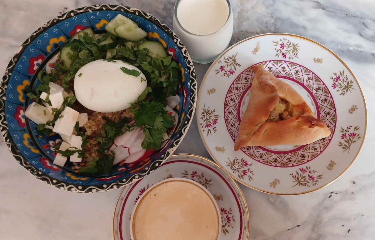 О моих запасах продуктов и бюджете на питание в июне можно почитать ЗДЕСЬ Каталог рецептов Покупка продуктов №1 -Магнит, Озон, Вкусвилл, Мегамаркет, Дикси Покупка продуктов №2 - Магнит, Черкизовский МК, Мегамаркет, Смарт, Вкусвилл, рынок Завтракаем боулом, как обычно в среду. Основа - киноа, к крупе добавила яйцо, редис, огурцы, фетаксу, кинзу, кунжутное масло. Еще пирожок с курицей и кофе с панна коттой на обед - очередной вариант холодного супа на кефире. На этот раз сделала райту. Супы разные по набору овощей, и вкус тоже разный у них получается. Тут вареные картофель и морковь, огурец, редиска, укроп. Все заливается кефиром, специи добавлять обязательно. К супу еще курники и вкусные помидоры махитос После обеда на десерт нектарин, чашка кофе и панна котта На ужин на скорую руку приготовила вермишель по-армянски, были колбаски (вчера готовила) и помидоры Вермишель покупала очень дешевую - за 15 руб/пачка. Приготовила даже не всю пачку, еще немножко осталось. Итого стоимость всего г