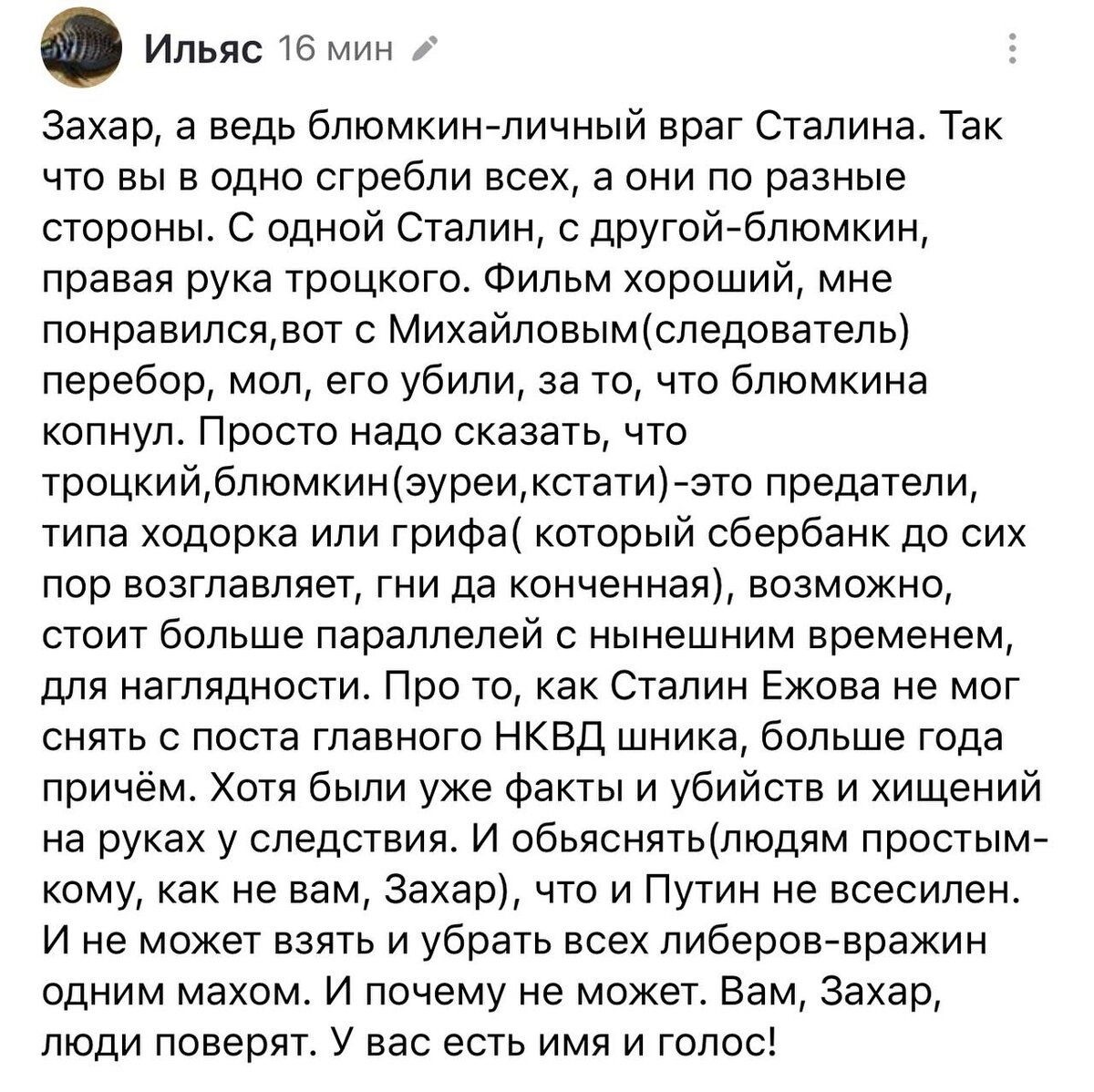 1. Ильяс, я говорю про новый фильм об «убийстве» Есенина (которого никто не убивал). В главной роли Петров. 2. Фильм, о которым вы говорите, – увлекательный в подаче и катастрофически лживый по смыслу. 3. К моменту смерти Есенина Блюмкин был в команде Сталина и от Троцкого ушел категорически. 4. Блюмкин – разведчик, идеалист, авантюрист, патриот, а также человек, действительно спасавший Есенина после его пьяных скандалов. В том декабре, когда Есенин повесился, он был в Киеве во главе государственной комиссии. Поэтому фильм ещё и пасквиль на человека, у которого алиби. 5. Троцкий – создатель Красной армии, выгнавшей интервентов. 6. Сталин мог снять Ежова и снял его, как только тот выполнил свои функции. 7. То, что вы здесь пишете – пример народной мифологии про доброго Сталина, которому мешали жиды и злой Ежов. Сталин – великий. Еврейское участие в революции принесло известные проблемы. Но в целом то, что вы пишете, не имеет никакого отношения к действительности. Извините. Ах, да. Пути